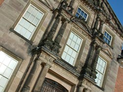 A closer view of the carved stone portico